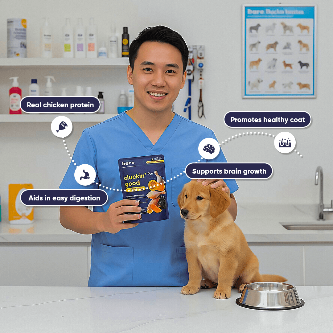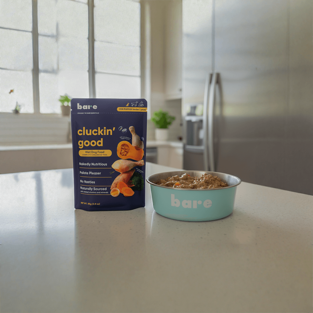 Start feeding your puppy Bare’s Cluckin’ Good Puppy Wet Food from 8 weeks (or weaning) with vet guidance. Packed with protein, DHA, and easy-to-digest nutrients, it supports healthy growth—simple, honest, nutritious.